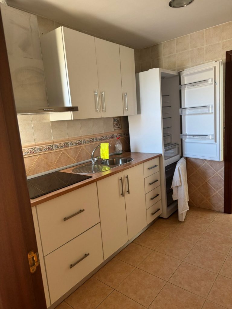 La cocina está totalmente equipada y amueblada, ofreciendo espacio suficiente para el día a día.
